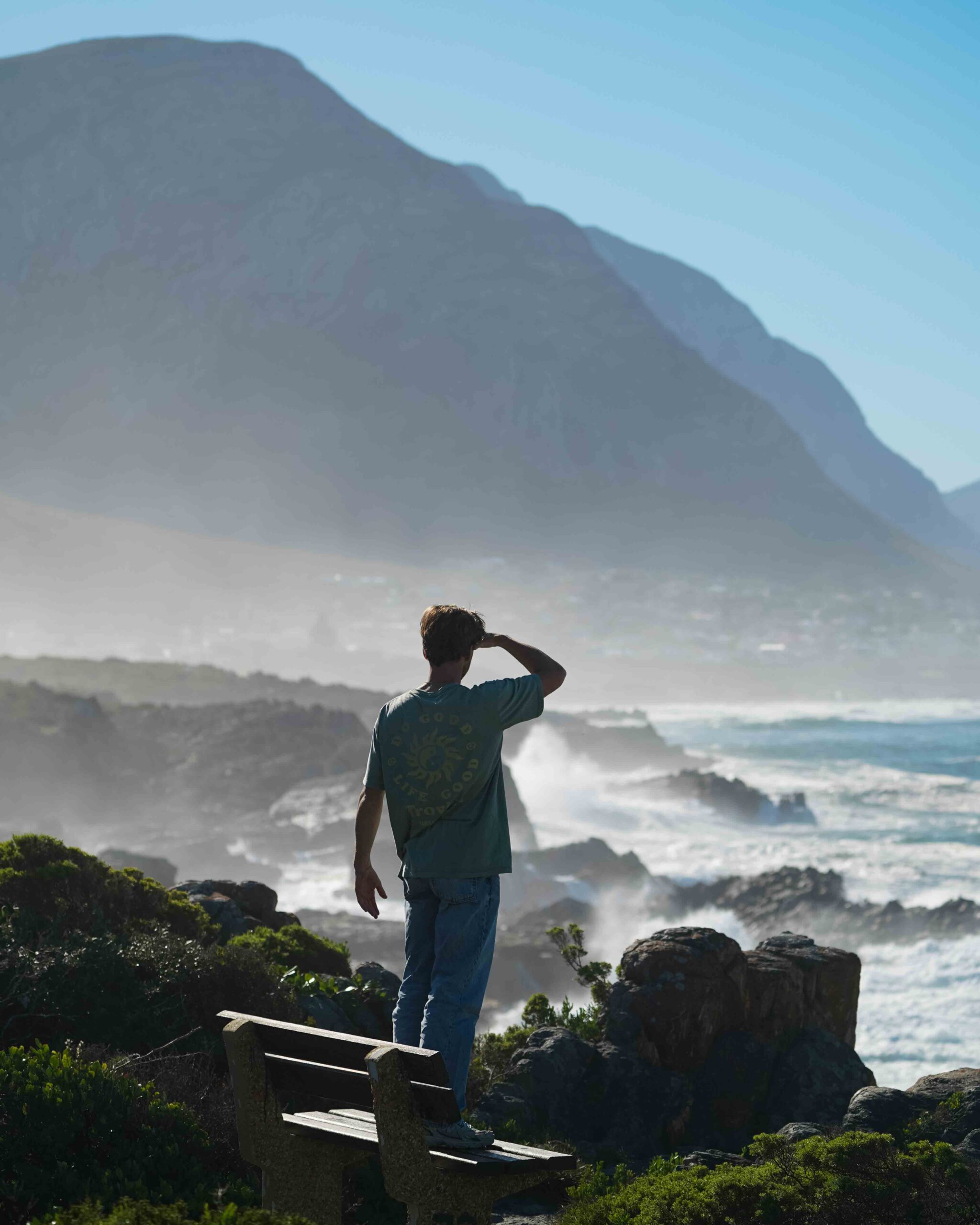 Vanaf Kaapstad neem je de Clarence Drive, een van de mooiste kustroutes van Zuid-Afrika. Deze 70 kilometer lange weg slingert tussen Gordon’s Bay en Rooi Els langs steile rotswanden aan de ene kant en de diepe blauwe oceaan aan de andere. Je rijdt letterlijk op de rand van de bergen, met het water zo dichtbij dat je tijdens hoogwater soms zelfs opspattende golven over de weg ziet slaan.